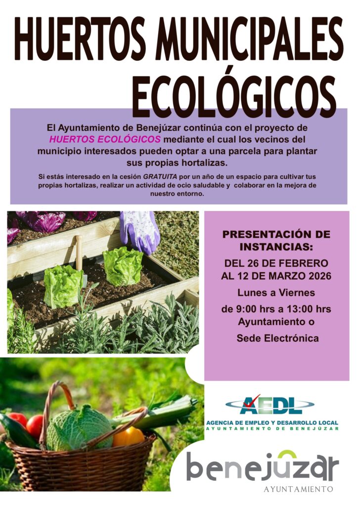 El Ayuntamiento de Benejúzar ha publicado el anuncio para la adjudicación de parcelas en los Huertos Municipales Ecológicos. Una iniciativa que permite a los vecinos y vecinas interesados optar de manera gratuita a un espacio de cultivo para plantar sus propias hortalizas y participar en una actividad de ocio saludable vinculada a la mejora del entorno.