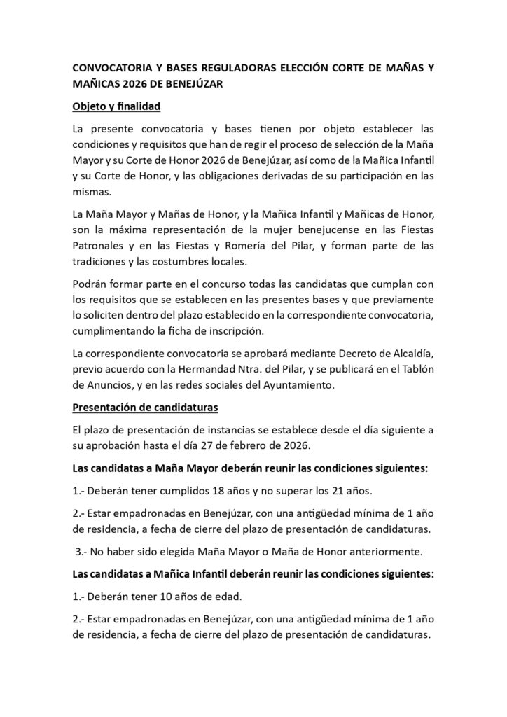 Convocatoria para la elección de la Corte de Mañas y Mañicas 2026 de Benejúzar