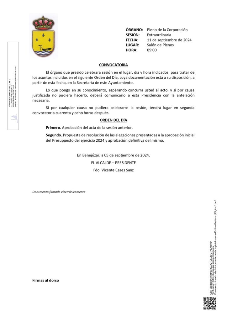 El próximo miércoles 11 de septiembre a las 9:00 horas, tendrá lugar en el Salón de Plenos del Ayuntamiento de Benejúzar un Pleno Extraordinario con el siguiente: